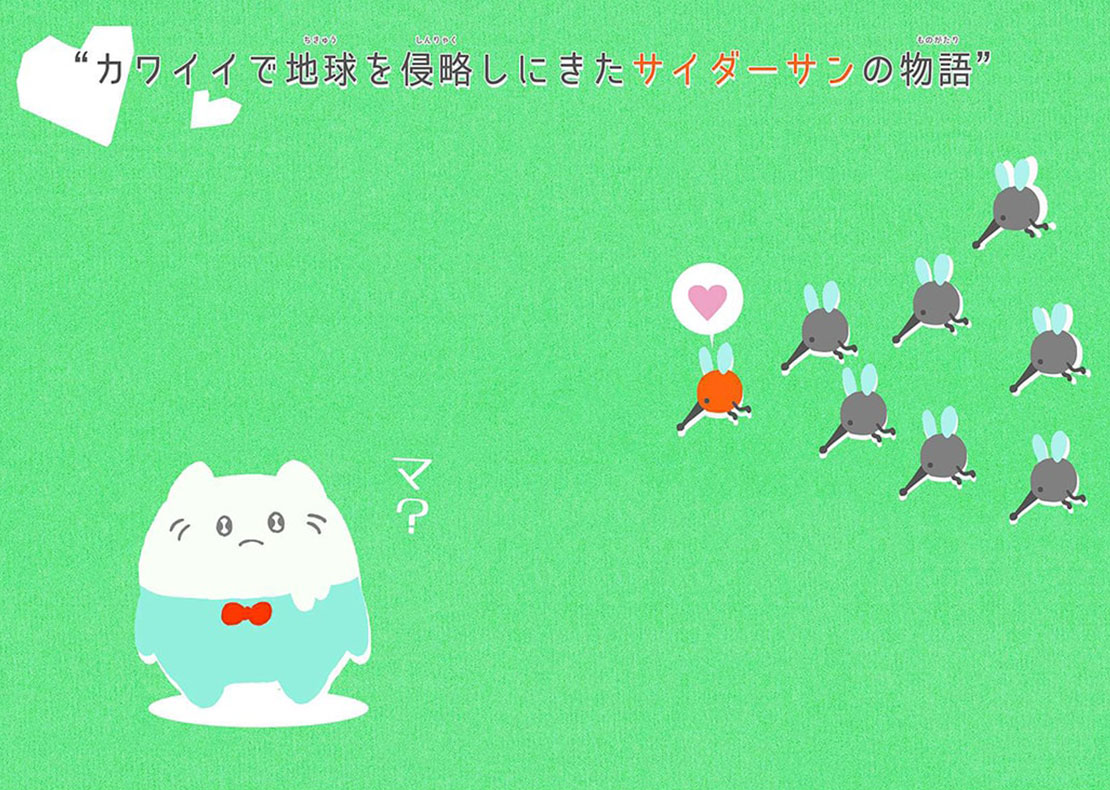 サイダーサンはカワイイものに変身ができますが、地球(いぬかしらこうえん)に住むカワイイ生き物たちに負け続けてしまいます。そんなサイダーサンは吉祥寺プティット村に逃げ込み、変身して身を隠し地球のことを観察することにしました。
