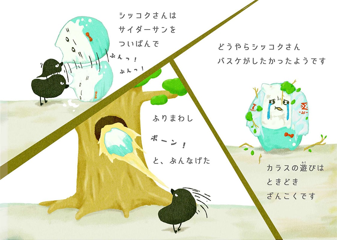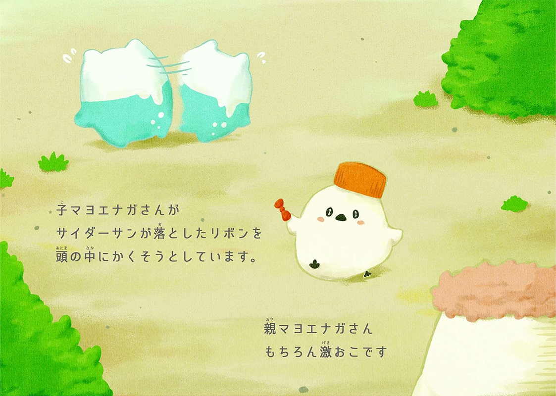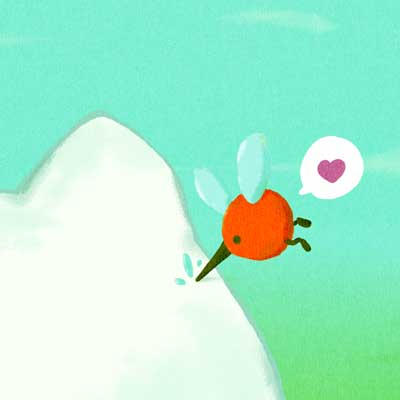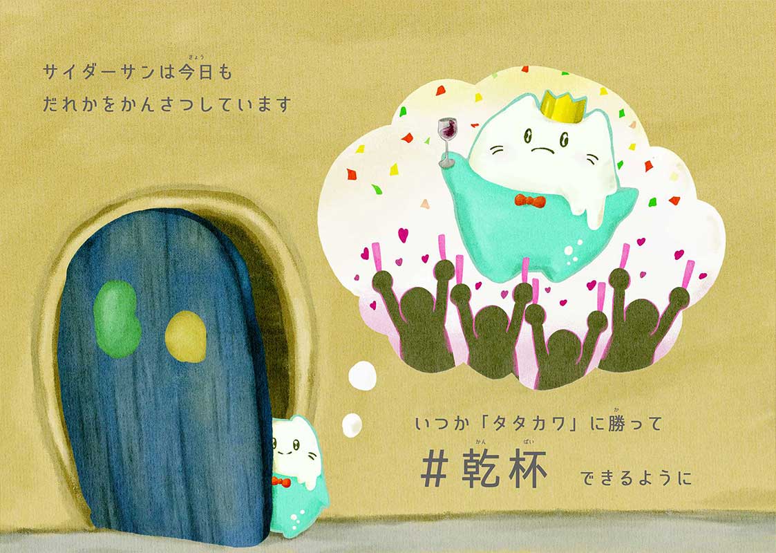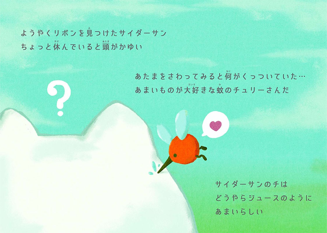「サイダーサン」の血液はジュースのように甘いようです。そのため、いつも甘いものが好きな蚊の「チュリーさん」に狙われています。